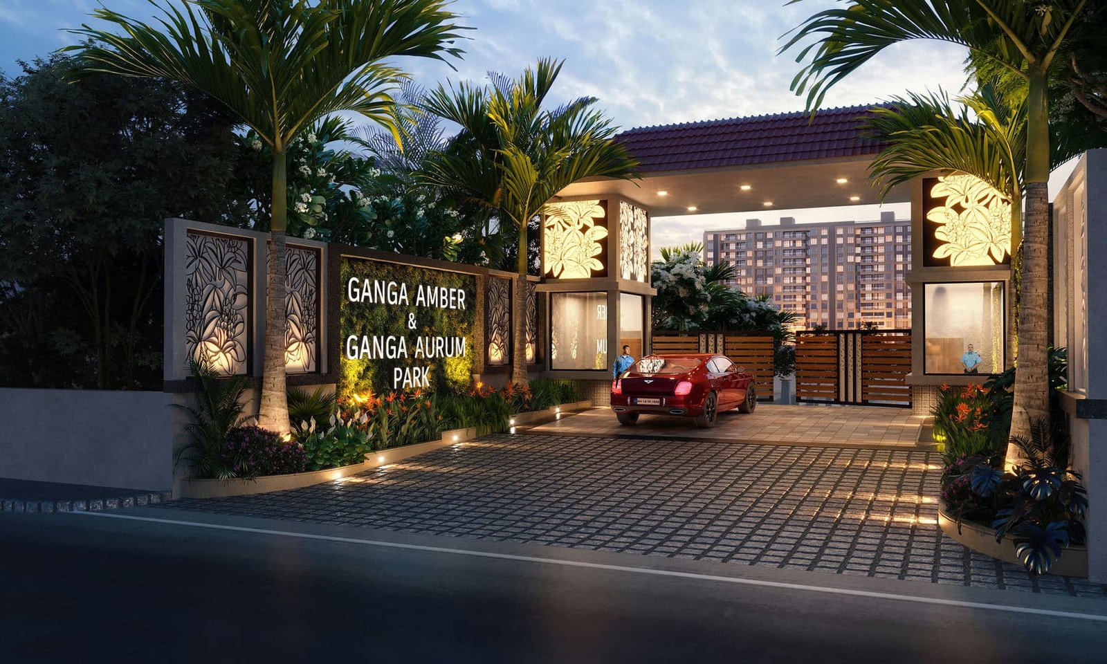 Step into a world of elegance and luxury as you approach the majestic and awe-inspiring grand entry gate of Ganga Amber. This impressive architectural landmark sets the tone for the premium living experience that awaits. Designed with meticulous attention to detail, the gate exudes a sense of exclusivity, promising a secure and prestigious living environment for its privileged residents.